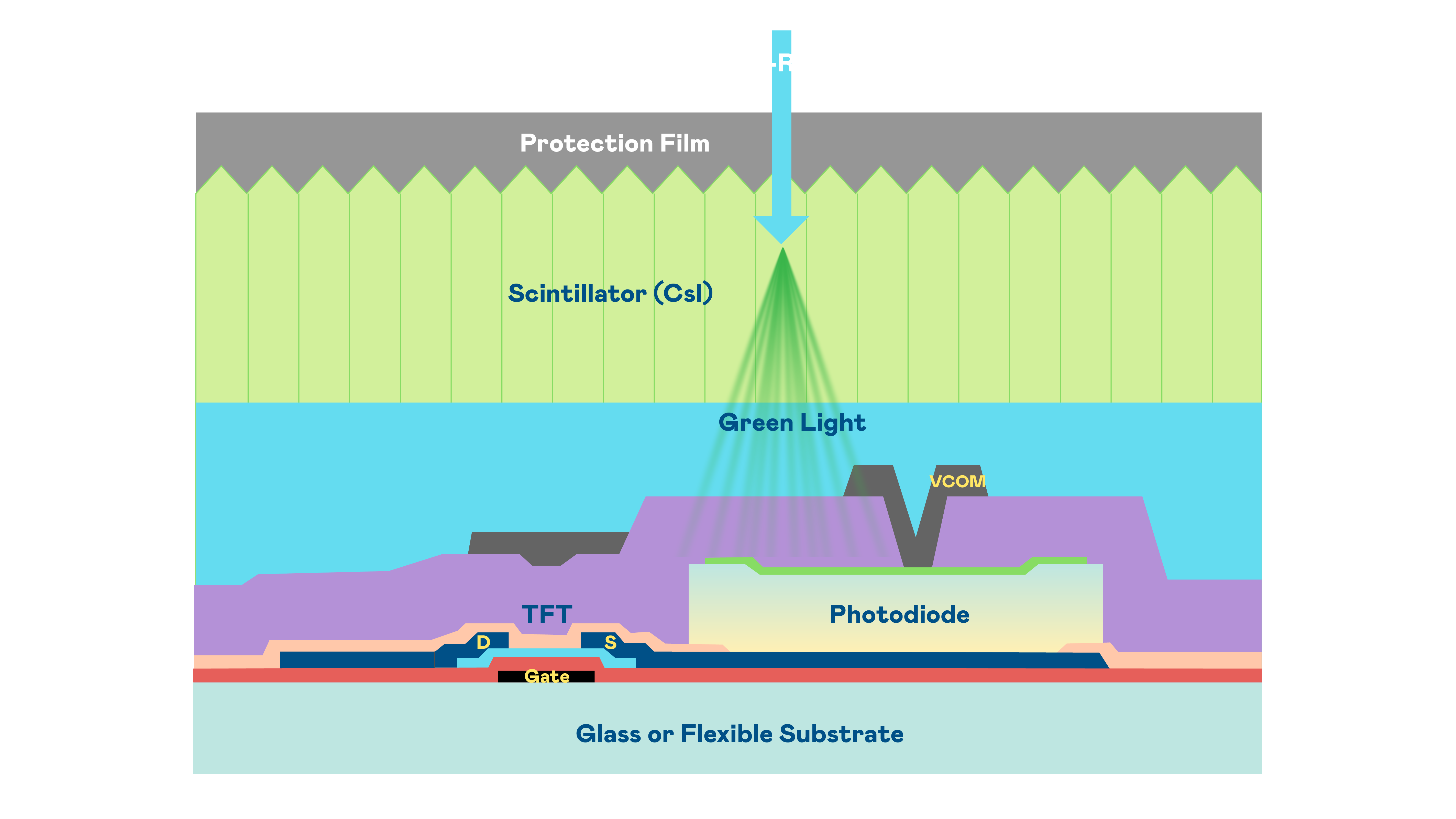 人生就是搏的X光影像感测阵列使用薄膜电晶体 (TFT) 作为每个像素的读取开关,搭配光电二极体(Photodiode)的光电转换元件,用以感测X光影像讯号。